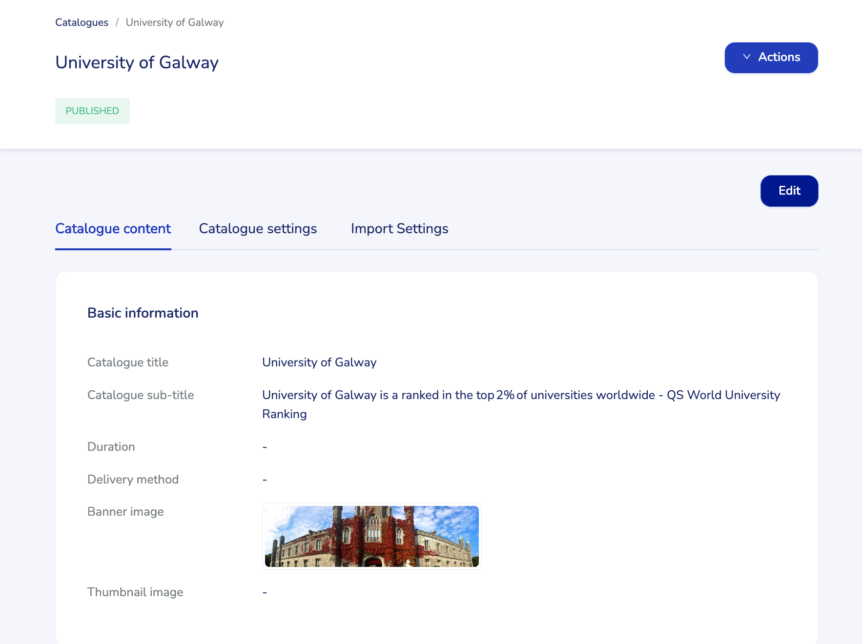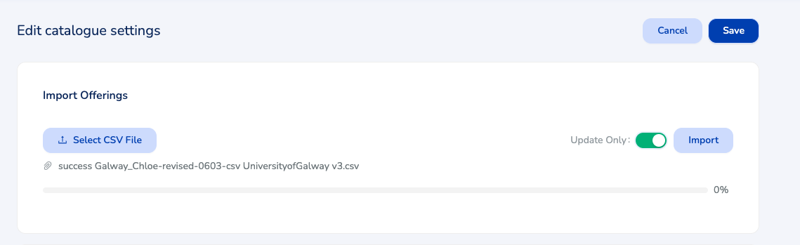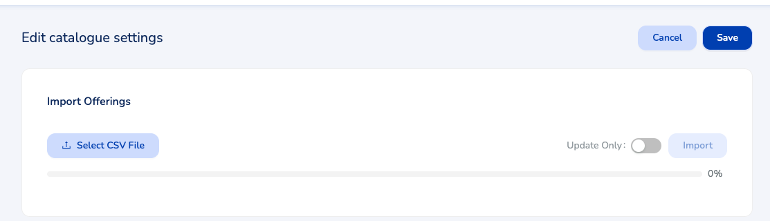 Once you're on the Catalogue settings tab, click to 'Edit' under the header on the top right. The 'Import offerings' section will appear at the top.