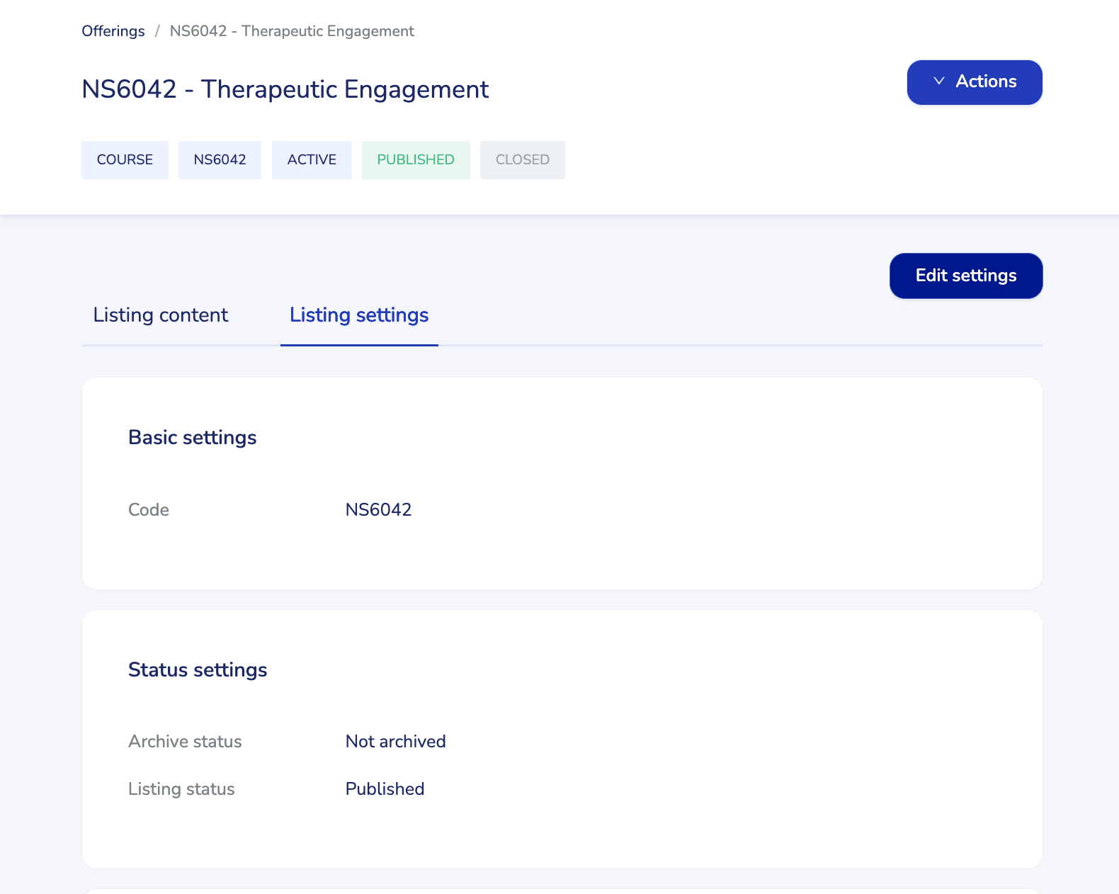 To add or amend a subject and topic category of an existing micro-credential, first select the offering from the Offerings tab. Click on the offering and go to Listing settings. Click to Edit settings.