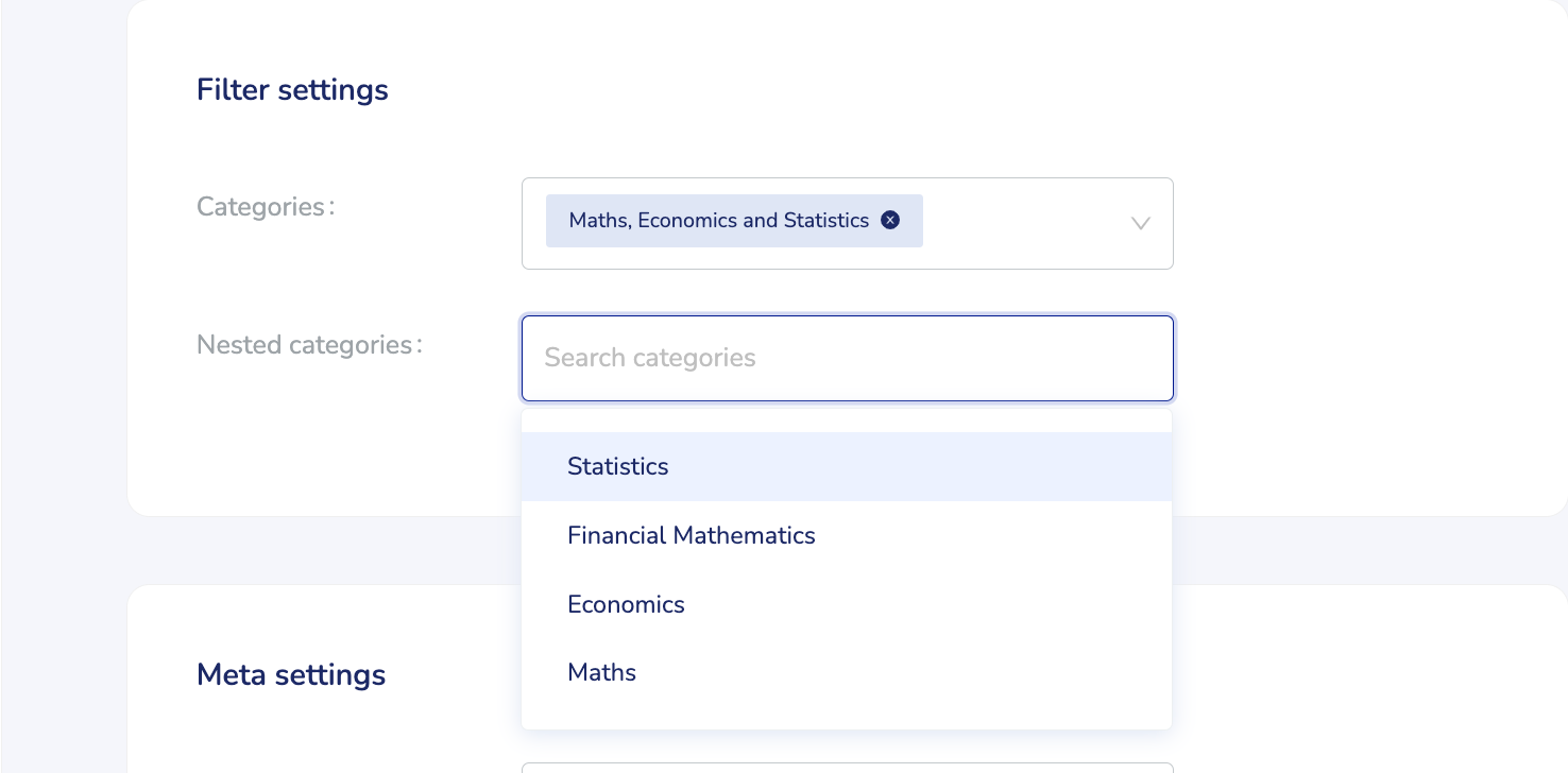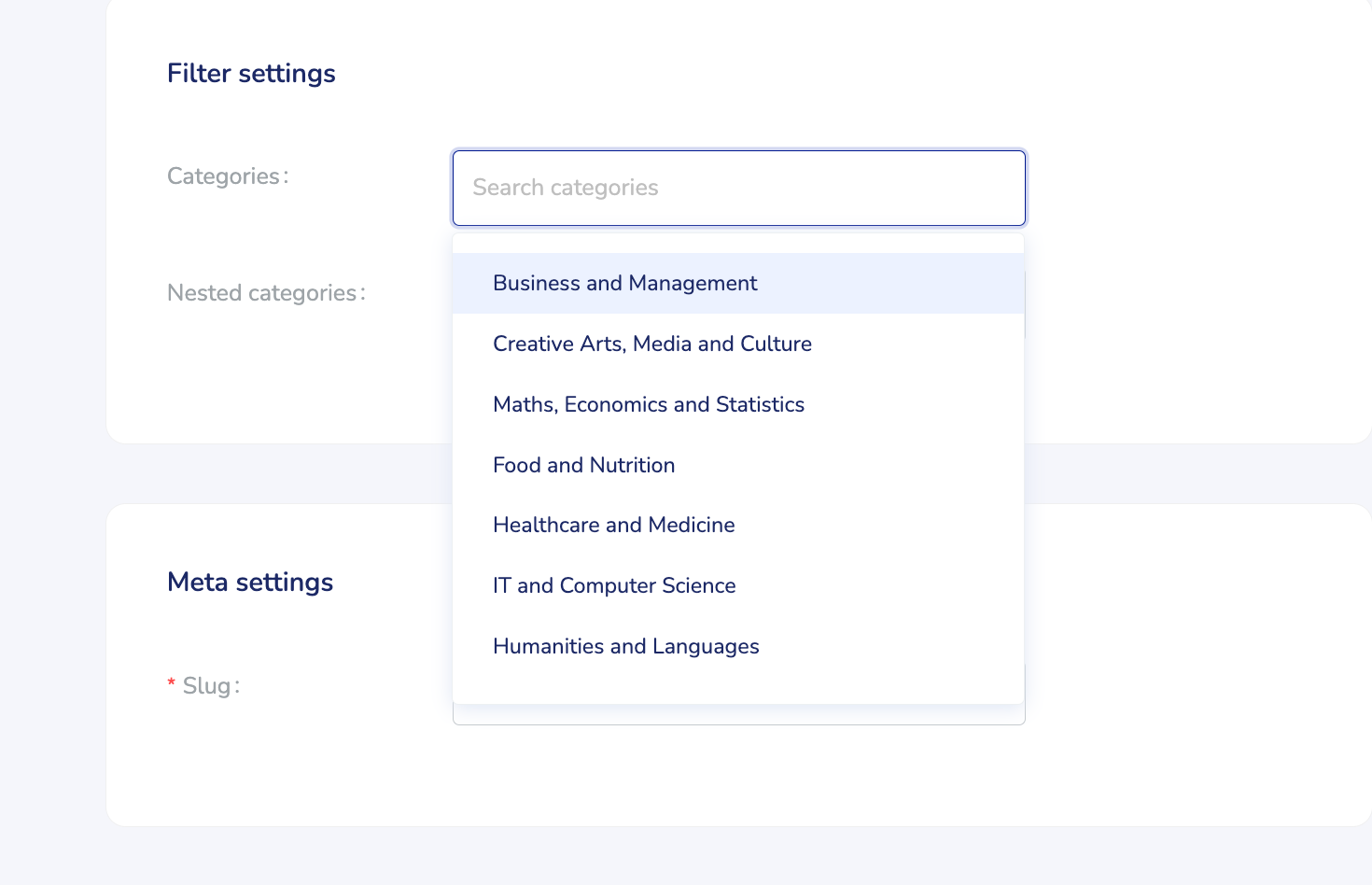Scroll down to Categories. From here you can choose overarching Subject areas (Categories) and more specific topics within chosen Subject areas (Nested Categories).