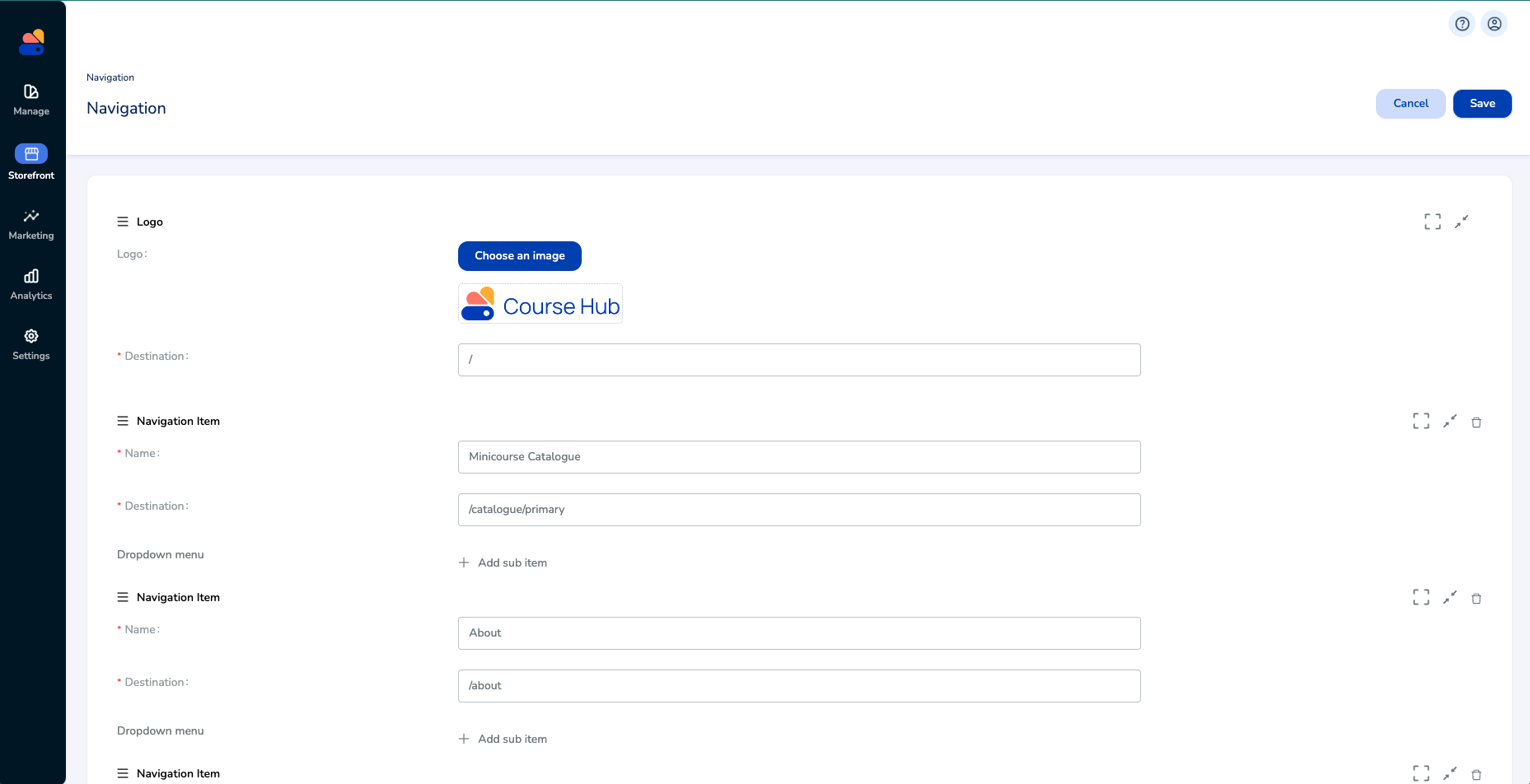 From here you can amend the logo shown in the top right of the navigation pane, delete and rename pages in the navigation and amend the hierarchy of site pages. Press save to confirm changes.